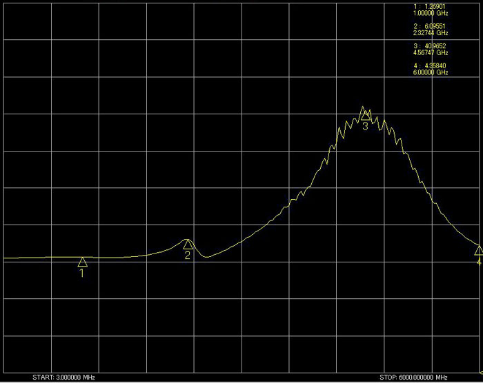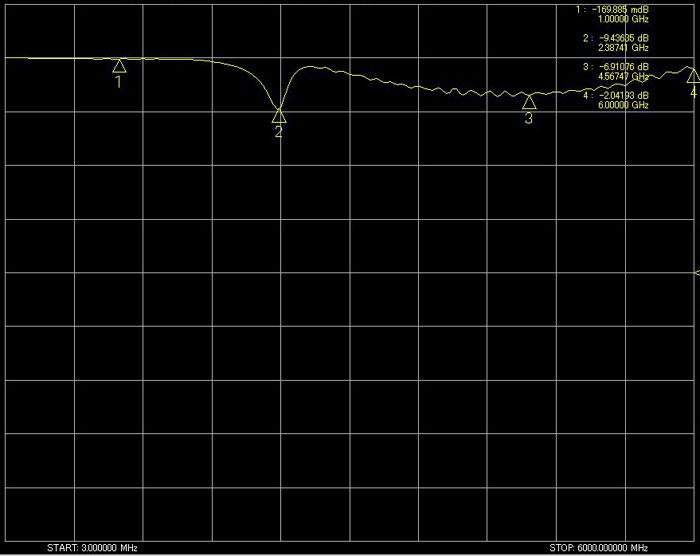 挿入損失:1GHz/1.69885dB 2.38GHz/9.43685dB 4.56GHz/6.91076dB 6GHz/2.04193dB