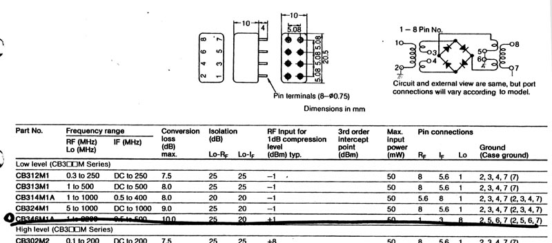 CB346M1A RF / LO 1 - 2200MHz( 2400MHzでも使用可能です ) IF 0.5 - 500MHz 変換ロス=10dB max, アイソレーション 25dB/LO-RF 20dB/LO-IF RF入力 +1dBm typ,( 最大入力 50mW/+17dBm ) ピン接続は上図を参照して下さい。