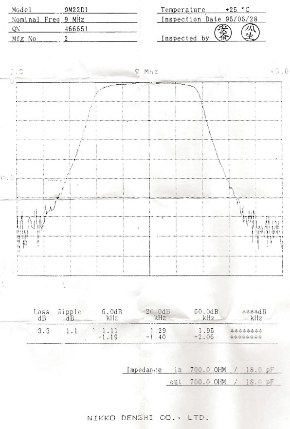 NIKKO DENSHI 9M22D1 9MHzクリスタル・フィルターのデータ