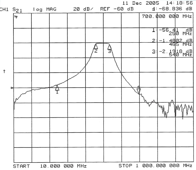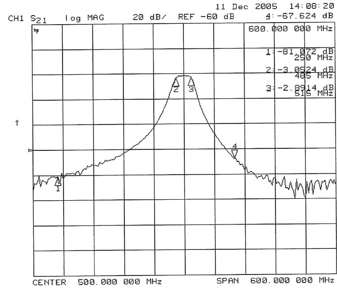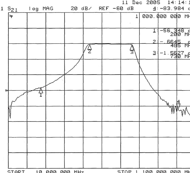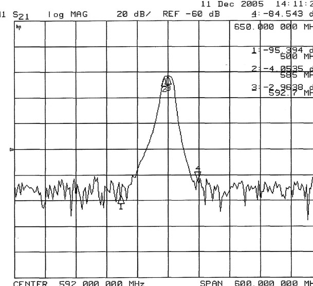 10MHzの挿入損失:0.85dB 20MHz / -83.6dB 30MHz / -87dB 50MHz / -82.7dB(