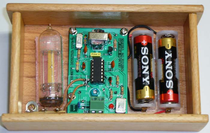 発振子をMT管の物に変更し、木箱に入れました。 単三電池2本で動作します。