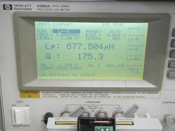 アンテナ・コイルの容量を測定しました。 677.5μH / Q = 175.3 1MHzにおいて
