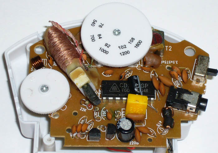 内部はちゃんとしたスーパー方式でした。 サイレン機能は、バー・アンテナの下側に見える1チップICがそうです。