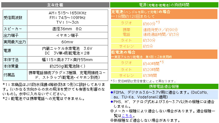 1分間( 120回 )廻して、携帯通話2分(待ち受け60分) ラジオ30分 ライト20分 サイレン5分ほど使えるようです。