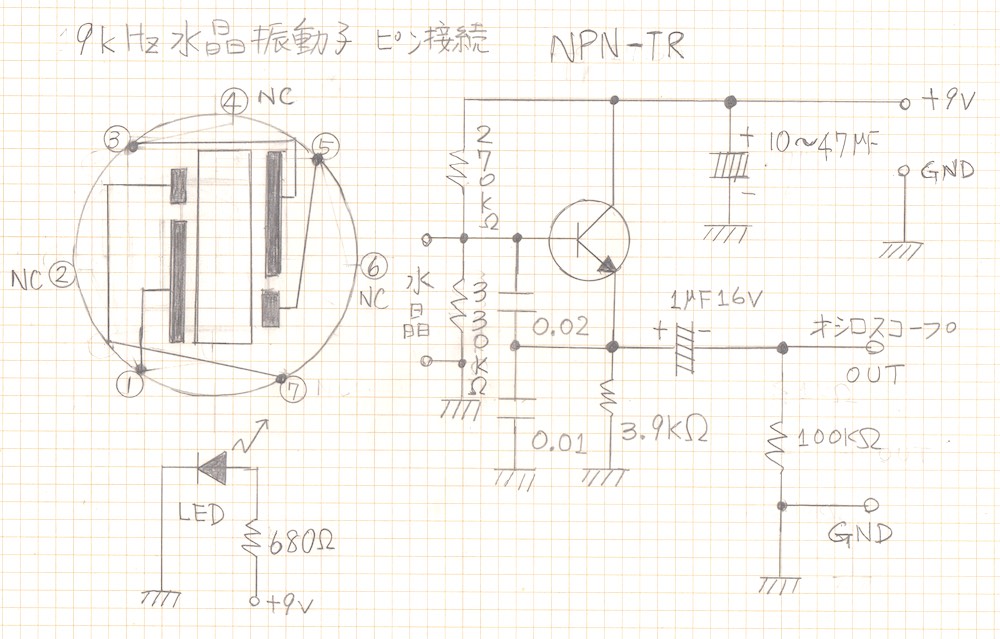 ※オシロスコープ観測出力にセラミック・イヤホン( または本物のクリスタル・イヤホン )を接続しても振動音を聴くことができます。