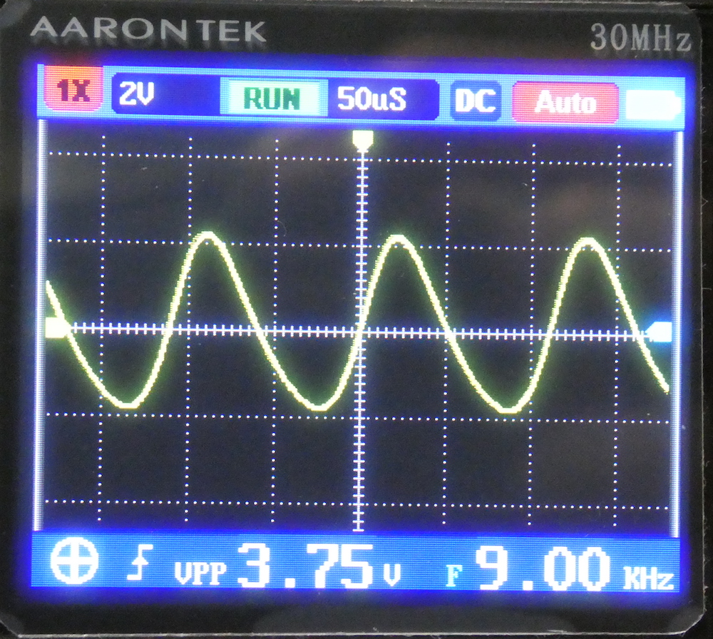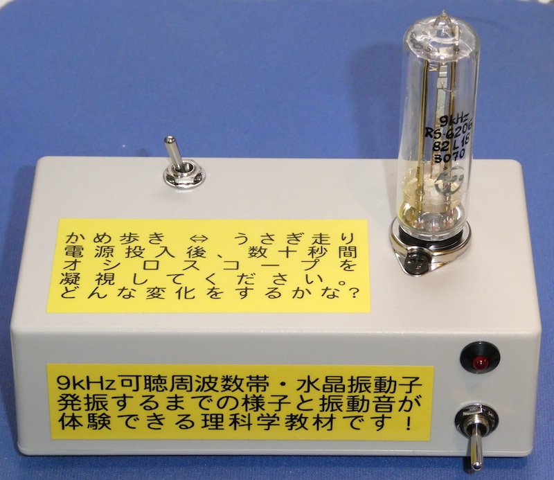 2、数十秒後に9kHzの振動音が聞こえる。(発振するまでの過程はオシロスコープを併用して観測できる。)