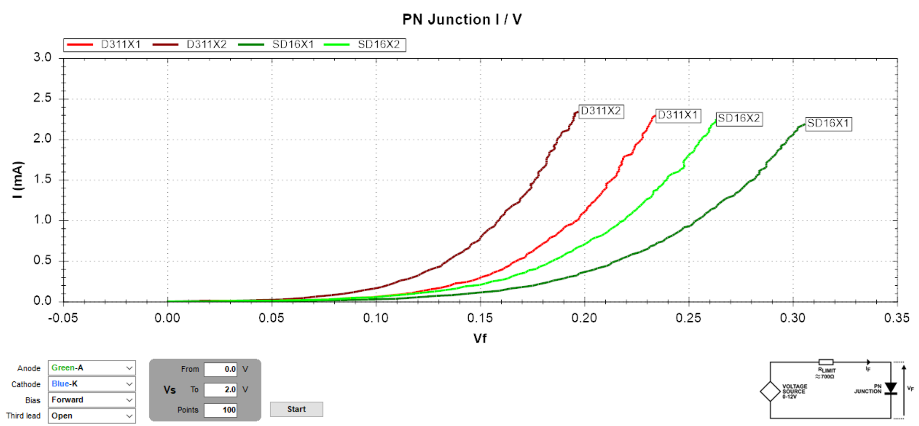 D311を1本、2本接続にした場合の順方向電圧特性・・・但し、これは直流での話。