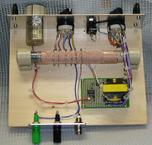左側の緑・黒端子は、外部アンテナ用です。 1次コイルと小容量コンデンサで結合しています。