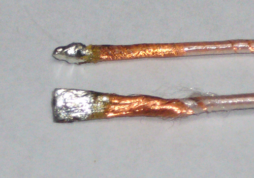 そのまま半田付けすると、下側の様に拡がってしまいます。