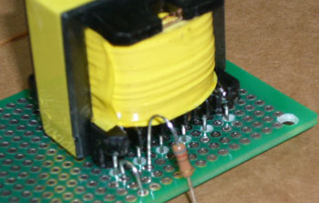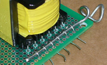 トランスの取り付け足の幅に合わせて、抵抗のリード等を利用して輪を作りトランスの足を挟んで締め付けた後で半田付けします。