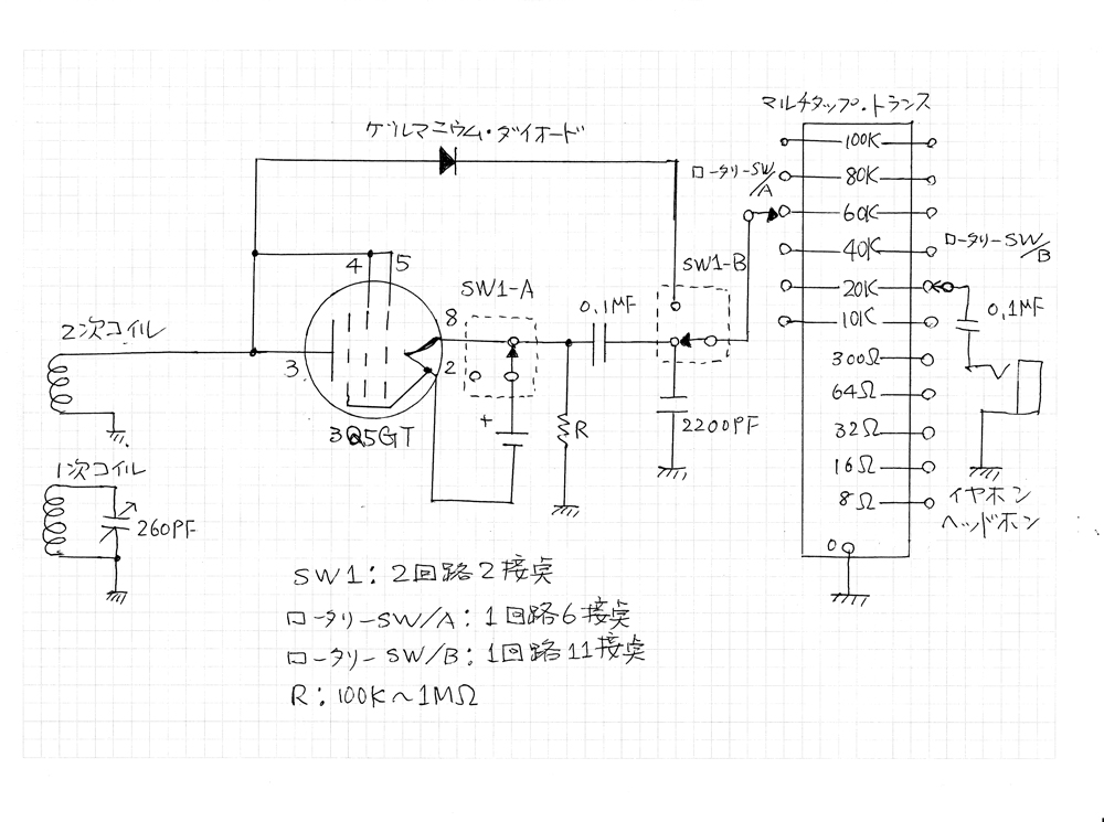 電池管/3Q5GTとゲルマニウム・ダイオード/D311検波を切り替えられる様にしたラジオです。