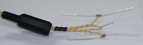 イヤホンを直列接続します。 両側に100kΩ抵抗を半田付けします。