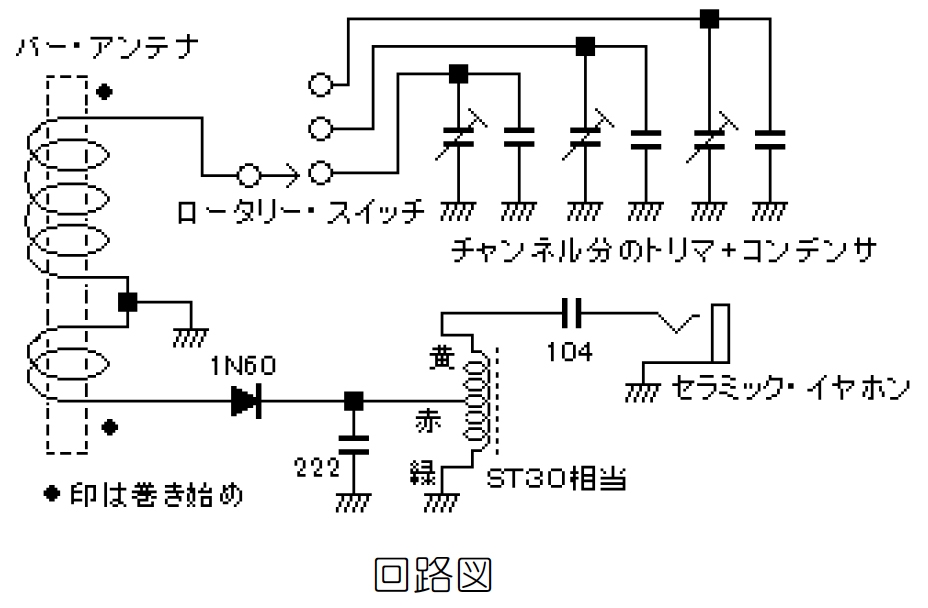 7局をトリマで固定同調にして、スイッチ切り替え。 1N60で検波 80mmバー・アンテナ