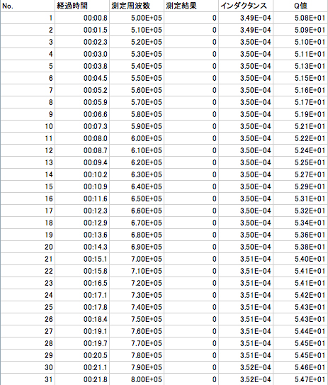 500 - 2000kHzを150ステップでインダクタンスとQ値を測定したい。