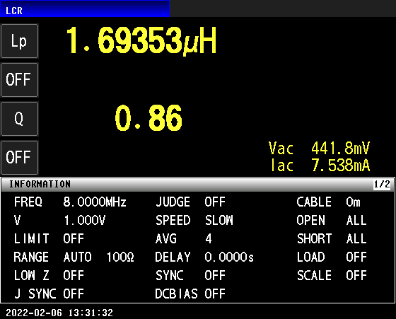測定周波数は、10kHzから8MHzまで10kHzステップでインダクタンスとQ値を同時測定